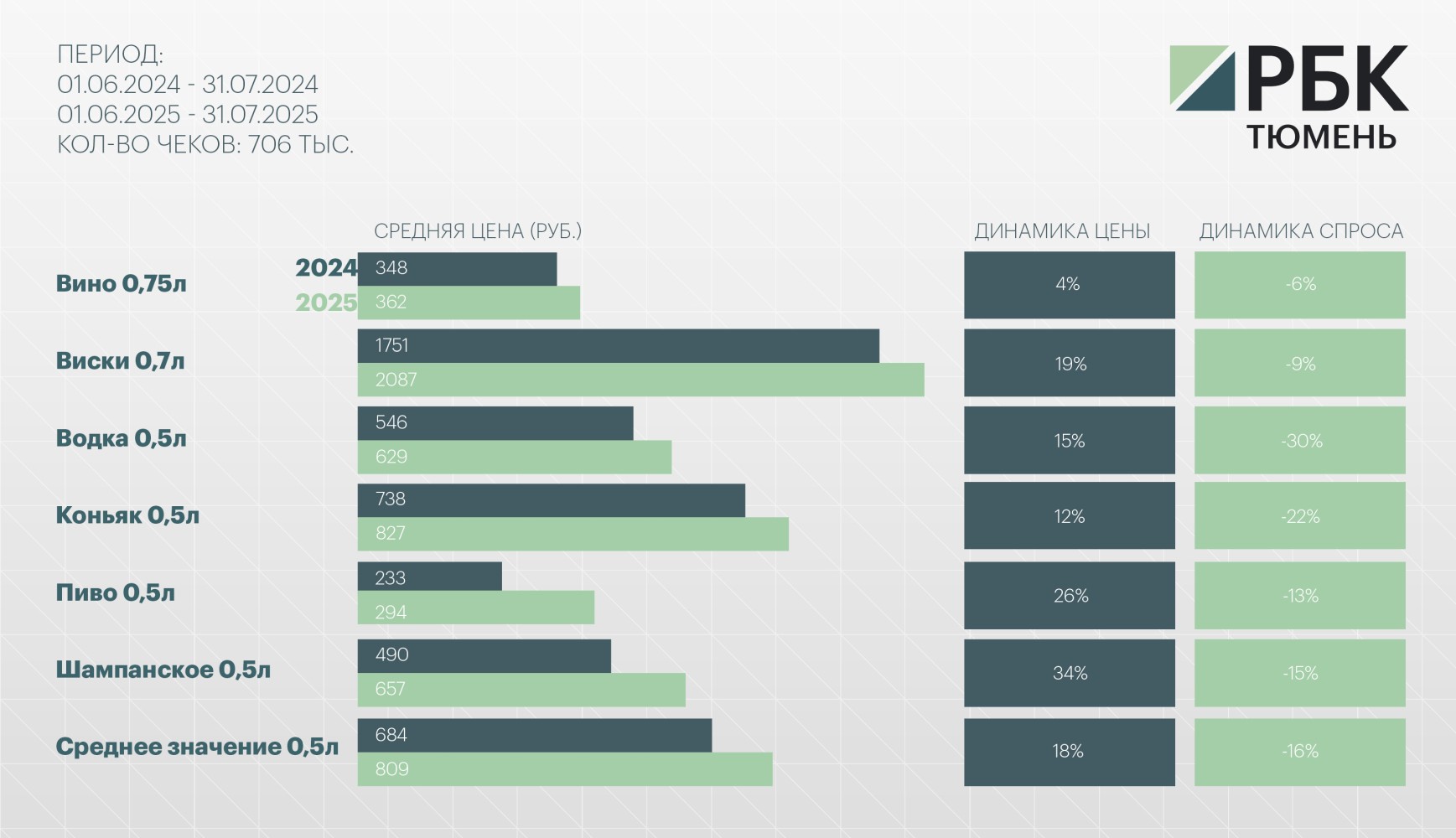 В целом по России за летние месяцы спрос на водку увеличился на 35%, а на виски — на 17%. Заметное падение зафиксировано по вину, коньяку (–26% в обеих категориях) и пиву (–23%). Шампанское показало снижение на 2%.